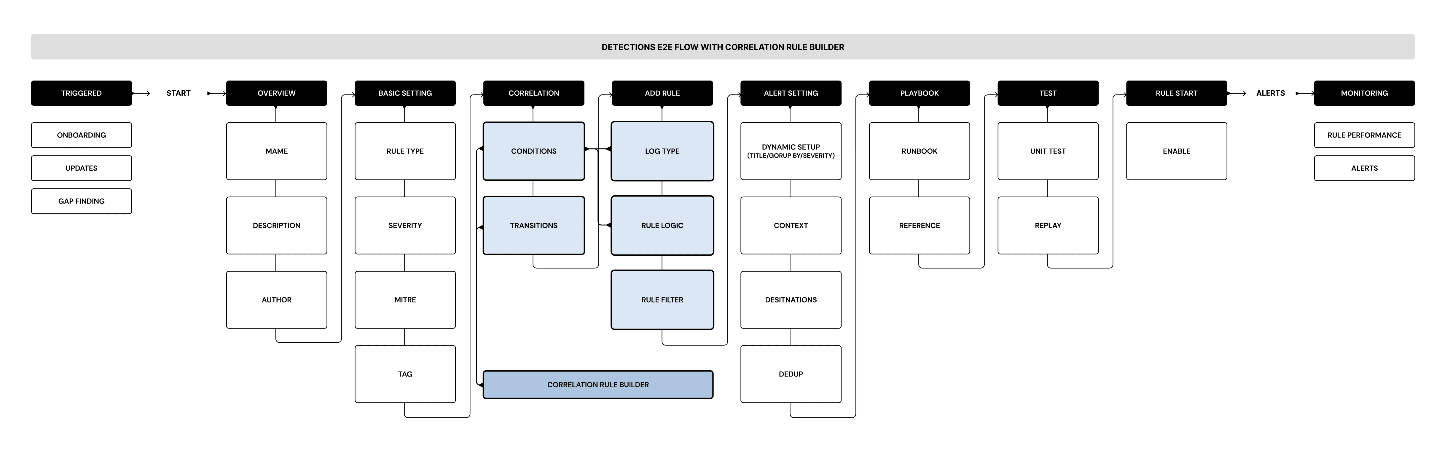 To fully grasp the impact of implementing new correlation rules within our detection workflow, I've begun mapping out the step-by-step user flows. This analysis will help us identify necessary modifications to existing processes and pinpoint the need for new supporting features. Creating this e2e flow chart offers several key benefits:
